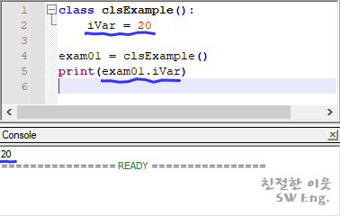 이전 예제에서 pass 부분을 지우고, iVar라는 변수 하나를 선언해보자. 이렇게 선언된 iVar는 clsExample 클래스의 멤버 변수가 된다. 그리고 정의된 멤버 변수는 클래스 외부에서 생성된 객체를 통해 참조할 수 있다.