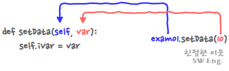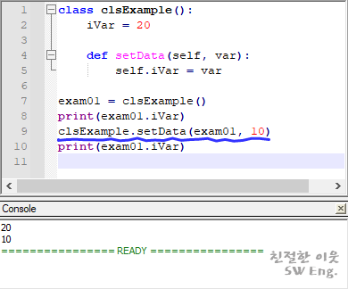 클래스의 메소드를 정의하고 있는 4번과 5번 라인의 코드를 보면, def 이라는 키워드로 시작해서 매개변수를 가지고 있는 모양새까지, 펑션을 정의하는 것과 일치하는 것을 알 수 있다. 그리고, 이렇게 정의된 메소드는 클래스의 멤버 변수를 참조하는 것과 같은 방식으로, 객체와 함께 호출할 수 있다. 하지만, 예제 프로그램에서 setData 메소드는 분명 2개의 매개변수를 가지고 있지만, 실제 메소드를 호출하는 9번 라인에서는 하나의 데이터만 전달하고 있고, 프로그램은 에러 없이 정상적으로 완료되었다.