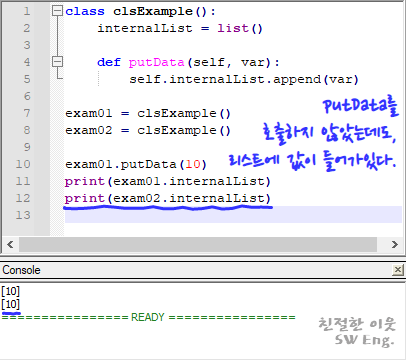 그런데, 지금까지 이야기한 방법은 한 가지 문제가 있다. 위 그림에서 보면, clsExample 클래스의 객체로 exam01과 exam02를 생성하였고, 그 중 하나의 객체에만 putData 메소드 호출을 통해 멤버 리스트를 변경하였다. 하지만, 각각의 객체를 통해 참조한 멤버 리스트가 모두 변경되었음을 확인할 수 있다.