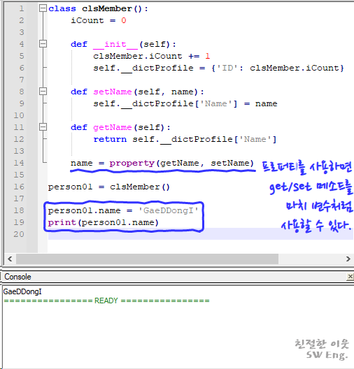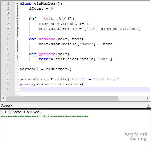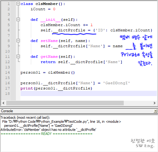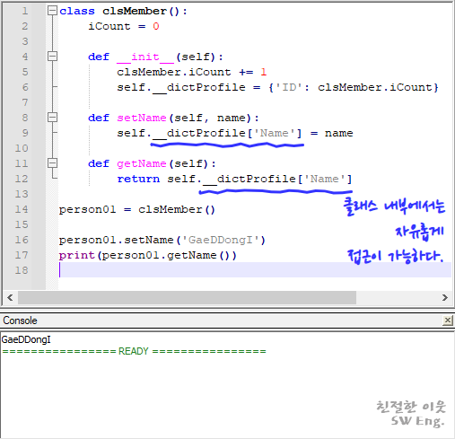 본론으로 들어가기 전에 위 그림을 잠깐 들여다보자. 그림의 예제 프로그램에서는 clsMember라는 클래스가 하나 정의되어 있고, person01이라는 객체도 하나 정의되어 있다. 그리고, iCount라는 클래스 멤버 변수가 하나 있고, dictProfile이라는 딕셔너리를 객체의 멤버 변수로 가지고 있다. clsMember 클래스는 setName과 getName이라는 메소드도 가지고 있다. 메소드의 내용을 보면, 이름을 전달 받아 딕셔너리의 원소로 추가하는 동작과 딕셔너리 안에서 이름을 반환하는 동작이 정의되어 있다. 하지만, 실제로는 메소드를 통해 접근하지 않고 객체를 통해 직접 딕셔너리에 원소를 추가하고 있다.