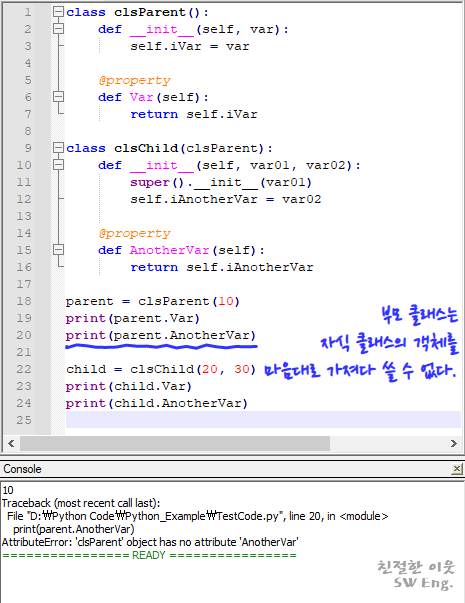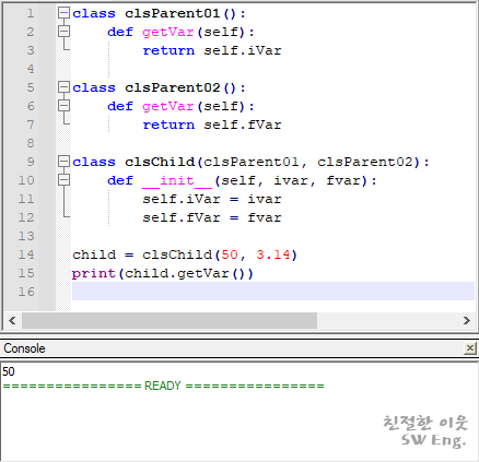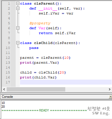 이번에는 처음 예제 프로그램에서 clsChild 내부에 생성자 메소드와 get 메소드를 하나 정의하였다. 처음 예제에서 clsChild는 pass 처리되었지만, clsParent 클래스의 내용을 상속 받았으므로, 객체의 생성 및 get 메소드를 호출해서 사용할 수 있었다. 이것을 바꿔 말하면, 부모 클래스의 생성자 메소드까지도 모두 상속 받아서 사용했다는 의미이다.
