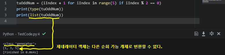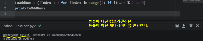 그럼, 튜플은 왜 결이 다른가?? 라는 부분에 대한 내용도 살펴볼 필요가 있다. 위 그림은 홀수 값을 원소로 갖는 리스트 컴프리헨션의 내용을 튜플에 적용했을 때의 결과를 보여주고 있다. 1, 3, 5의 원소가 소괄호에 묶인 튜플을 기대했으나, 전혀 엉뚱한 문장이 출력으로 반환되었고, 이것을 제네레이터 객체라고 부른다.