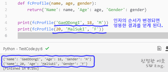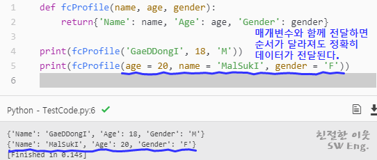 하지만, 펑션을 정의할 때 사용한 매개변수의 이름과 함께 데이터를 전달한다면, 호출하는 과정에서 입력한 순서와 관계 없이 원하는 매개변수에 원하는 데이터를 정확히 전달할 수 있다. 파이썬의 이러한 특성 때문에라도, 펑션을 호출할 때는 매개변수와 함께 데이터를 전달하는 습관을 가지는 것이 여러가지로 필요해 보인다.
