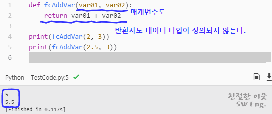 IEC 표준 언어를 포함한 대부분의 프로그래밍 언어에서는 펑션을 정의할 때, 어떤 타입의 데이터를 반환할 것인지를 지정해주어야 한다. 하지만, 파이썬은 전달되는 데이터에 따라 타입이 결정되는 동적 프로그래밍 언어이므로, 펑션이 반환할 데이터 타입을 지정해주거나, 매개변수로 전달되는 데이터 타입을 지정할 필요가 없다.