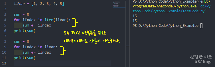 그렇다면, 이쯤에서 의문이 생길 수 밖에 없는 것이... 지금까지 FOR 반복의 개체로, 4번 라인의 이터레이터 객체 대신 9번 라인처럼 리스트 타입의 데이터를 직접 사용했지만, 파이썬 인터프리터는 아무런 에러 없이 동작했다는 점이다.